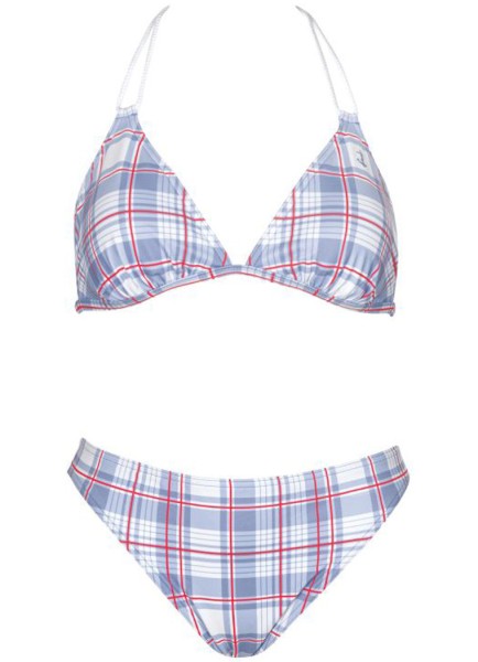 Karo goes Beach. Karomuster in Weiß, Hellblau und Rot. Ein stylisches und gleichzeitig frisches Design. Triangel-Bikini mit herausnehmbaren Softschalen. Der kleiner Anker-Print und die Kordel-Träger verleihen dem Design einen maritimen Touch. Das Top ist am Nacken und Rücken zu binden. Hüfthose mit schmaler Seitenhöhe. Nachhaltige Bademode: OLYMPIA® GOES NEXT LEVEL – Bademode aus recyceltem Material.
